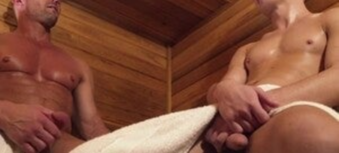 Op een gegeven moment werd het langzaamaan wat drukker in de sauna, en was er een leuke vent met een staartje in zijn haar, die we een aantal keren tegenkwamen, hij keek de hele tijd naar ons, en toen wij op een gegeven moment op de achterste bank zaten in de filmzaal kwam hij ook binnen, ik had mijn handdoek afgedaan, ik zat er alleen maar op, en mijn pik stond keihard omhoog, klaar voor actie, mijn vriend had ondertussen ook een half stijve lul, hij zag ons daar zo zitten en kwam gelijk naar ons toe, ging op zijn knieën tussen de benen van m'n vriend zitten en nam zijn half stijve lul in zijn mond, en met zijn hand pakte hij mijn harde pik beet en begon deze te masseren, heerlijk om te zien hoor, de ondertussen harde paal van m'n vriend bij hem in de mond, hij trekt met 1 hand mij af terwijl hij met de andere hand zichzelf aan het verwennen is.